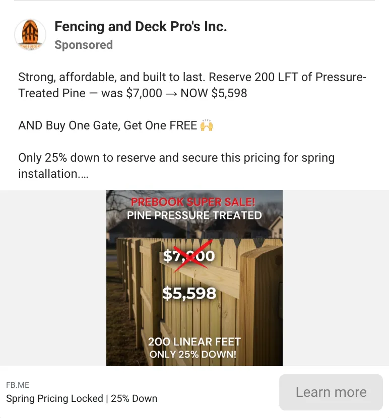 First, we run Facebook and Instagram ads specifically in the higher-income areas of your service zip codes, so you’re attracting homeowners who can actually afford a new fence.